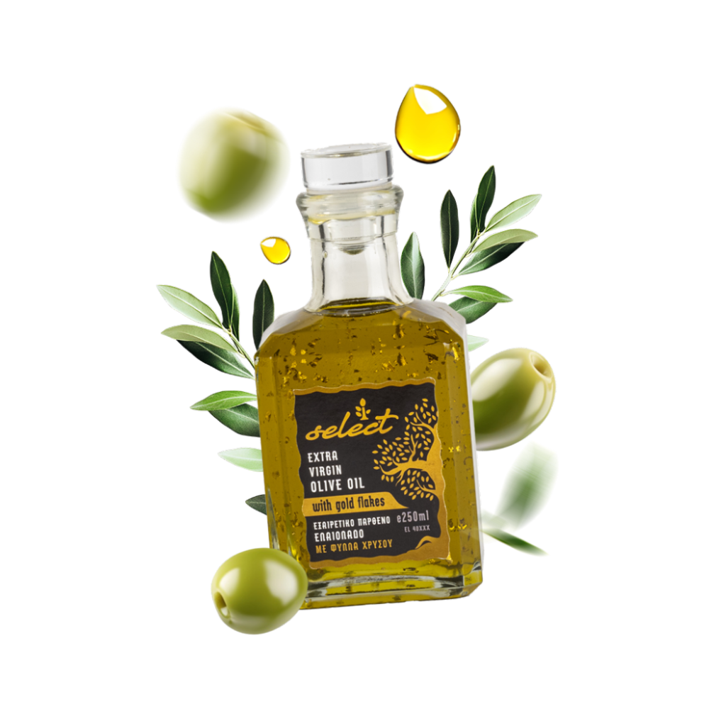 100% Εξαιρετικό Παρθένο Ελαιόλαδο με Φύλλα Χρυσού.